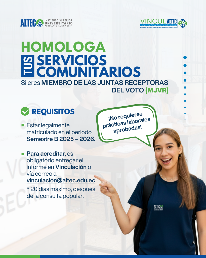 La Unidad de Vinculación con la Sociedad del AITEC, realiza la Inducción sobre el desarrollo de la propuesta para los servicios comunitarios, efectuada el día 10 de marzo del 2025, de 7 a 10 pm (modalidad virtual); contando con la participación de los estudiantes de las diferentes carreras pertenecientes al Instituto Superior Tecnológico Almirante Illingworth con condición Universitario. Responsable de los Servicios Comunitarios: Ing. John Brito.